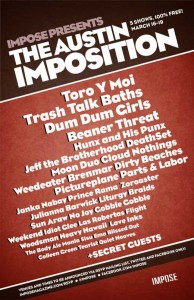 no comments | tags: Ale House, Austin Carniville, Austinist, Best Coast, Bone Thugs N Harmony, Brooklyn Vegan, Cheer Up Charlies, Dry Heeves, Dum Dum Girls, Fader Fort, Friendship Bracelet, Fun Fun Fun Fest, Gorilla Vs. Bear, I Guess I'm Floating, Indie-Verse, Japandroids, Javelin, La Panza, M For Montreal, Major Lazer, Mexican Summer, Monahans, Ms. Beas, Natrix Natrix Records, No Age, Numerators, One Wolf, Pitchfork, Rachel Ray, Ramble Creek, Rock Steady, Royal Bangs, Sammi Is Booking, Sandwitches, Showpaper, Small Black, SXSW, Tanlines, Telegraph Canyon, The Bitters, The Top 13, Thrift Store Cowboys, Todd P, Toro y Moi, True Panther Sounds, Walkmen, Washed Out, Weekly Tape Deck, Windish, WOXY | posted in List, SXSW